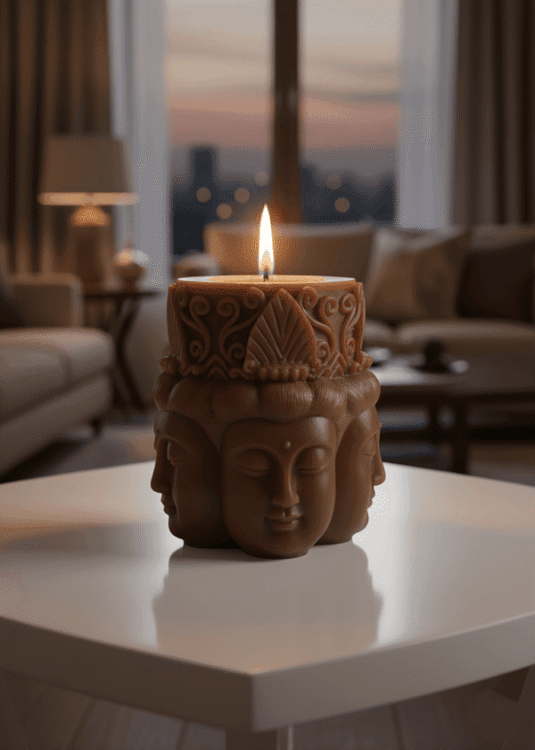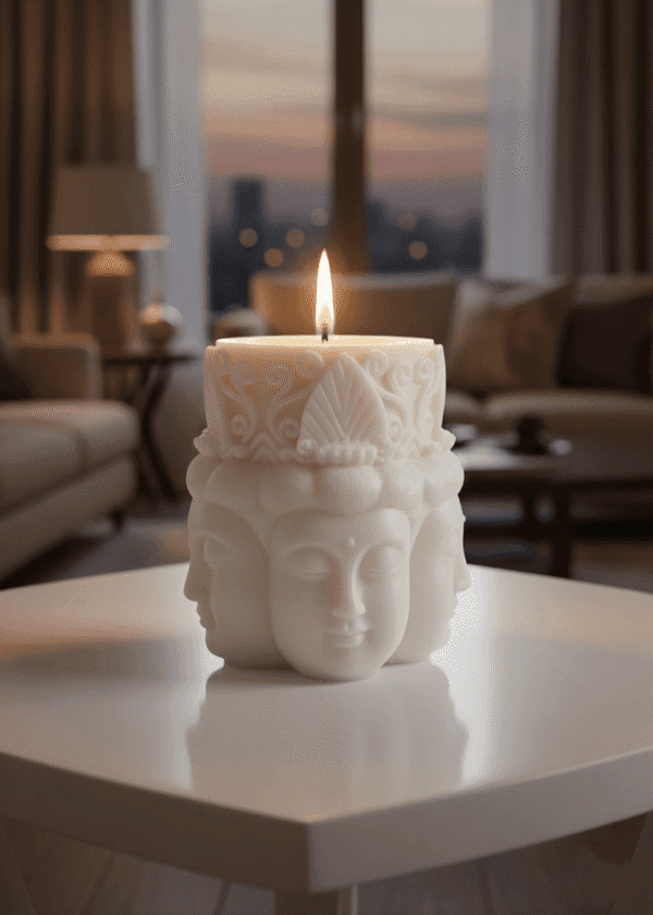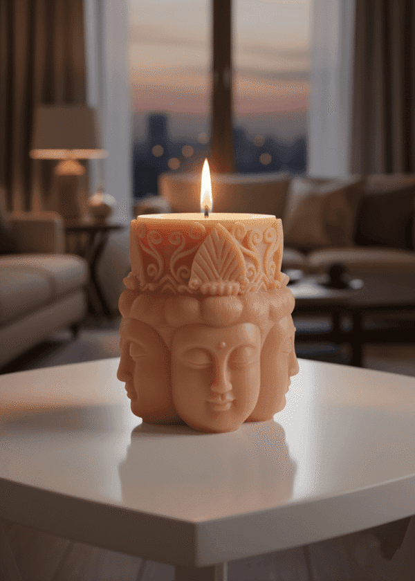 A profound tribute to the enlightened one, the Eternal Serenity candle is a beacon of peace, wisdom, and boundless compassion. This majestic candle features the four serene faces of the Buddha, each gazing towards a cardinal direction, symbolizing the universal reach of his teachings (Dharma). Crowned with a lotus throne of enlightenment, this is more than a candle; it is a sacred object for contemplation, designed to radiate profound tranquility throughout your space as it casts its clear, unwavering glow.