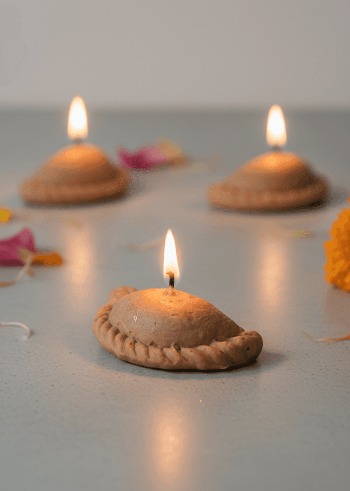 - Craftsmanship: This candle is a work of charming, rustic artistry. Its form meticulously captures the classic half-moon shape and the hand-pleated edge (goth) of a traditional homemade Gujiya. Each detail is lovingly handcrafted by our artisans at Divine Flames™ to evoke the authentic feel of this festive delicacy.